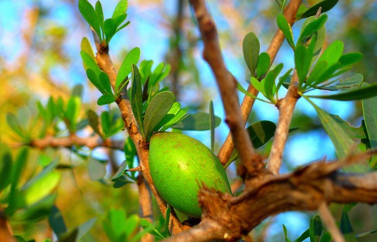 Arganöl – Argania Spinosa Kernel Oil – wird aus aus den Samen der Frucht des Arganbaums gewonnen. Diese sogenannten “Bäume des Lebens“ wachsen heutzutage ausschliesslich im Südwesten Marokkos. Um sie zu schützen, hat die Unesco die Region zum Biosphären-Reservat erklärt.
